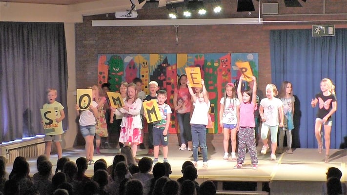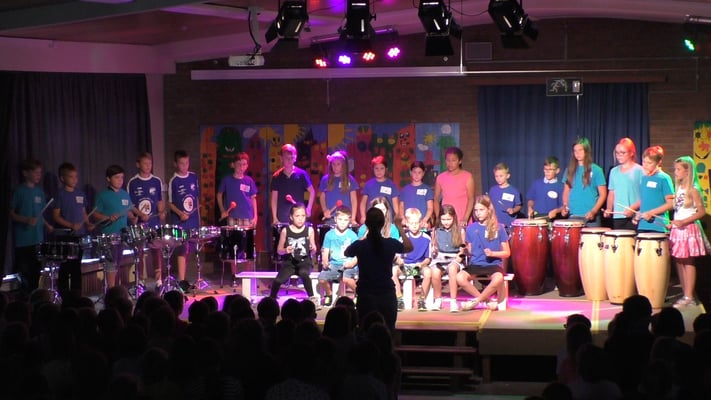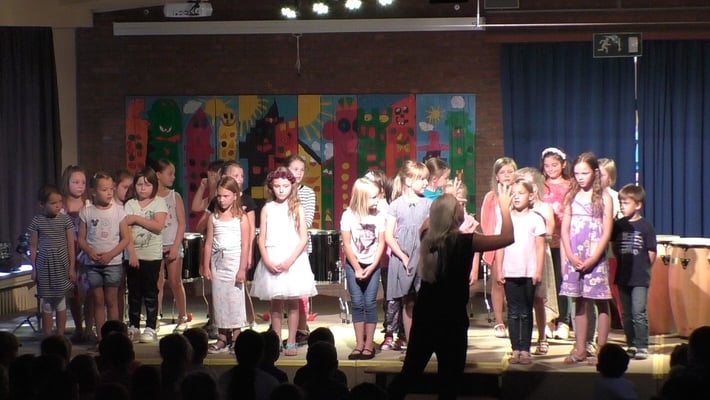 Am Donnerstag, den 12. Juli fand in der Aula unserer Schule zu Ehren unserer Viertklässler eine Abschiedsfeier statt. Jede Klasse führte dabei einen vorbereiteten Beitrag auf. Das Programm reichte von Liedern, Livegesang der Chor-AG und Trommelauftritt der Trommel-AG über Tänze und eine akrobatische Darbietung hin zu einer schauspielerischen Inszenierung eines Medleys von Lieblingsliedern der Klasse 4b.