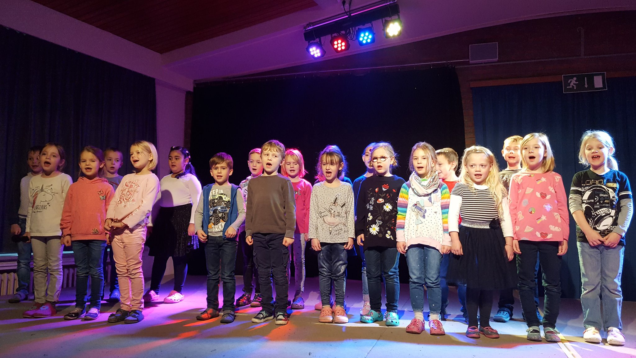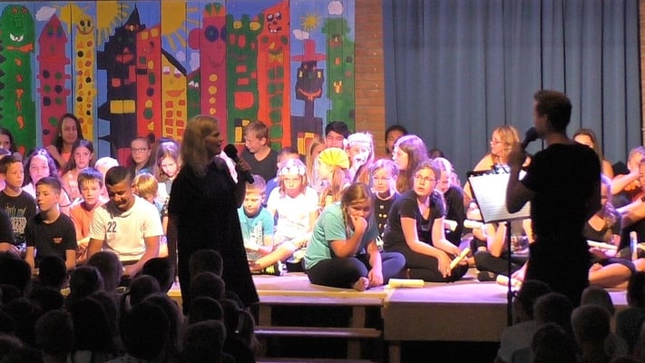 Nach hervorragender Unterhaltung mussten zum Schluss aber auch diesmal einige Tränen verdrückt werden, als alle Viertklässler zur Verabschiedung von Frau Ihl noch einmal auf die Bühne gerufen wurden. Daran konnte auch der aufmunternde Abschiedsrap von Frau Arndt und Herrn Stäglich nichts ändern.