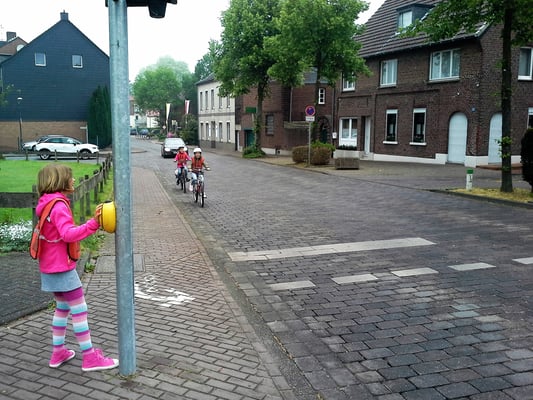 Das Linksabbiegen klappte nach diesem intensiven Training dann auch in der neuen Verkehrssituation an der Waldnieler Straße bei allen. Der Lehrer ließ jedoch an der Einmündung zur Schule bereits fertige Kinder auf die Fußgängerampel drücken: Prompt wurde die auf rot springende Ampel von einer auf dem Fahrrad ankommenden Schülerin überfahren. Es sollte bis zur praktischen Prüfung also doch noch weiter geübt werden;)