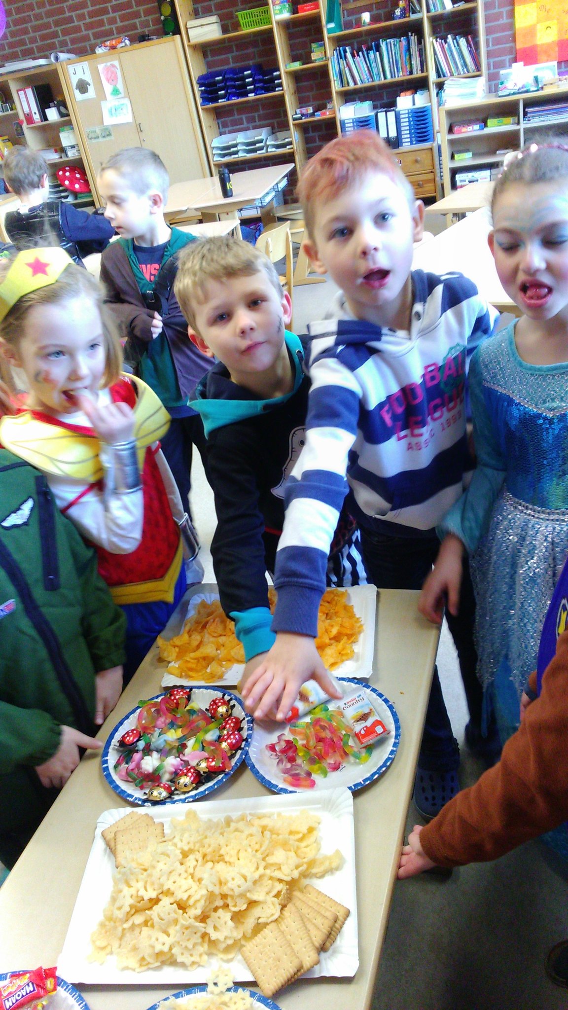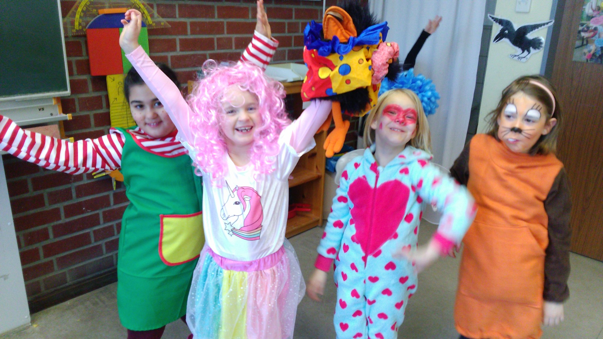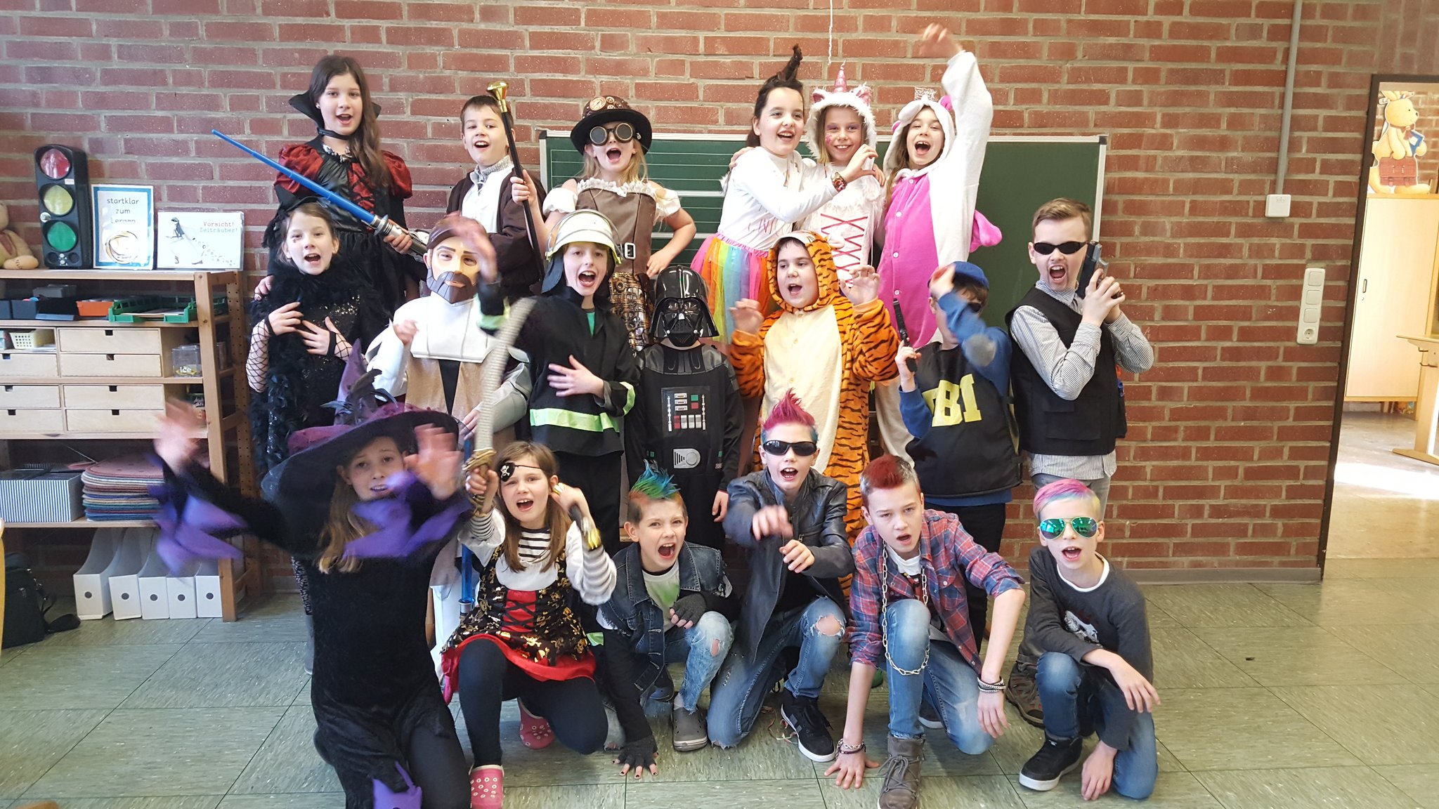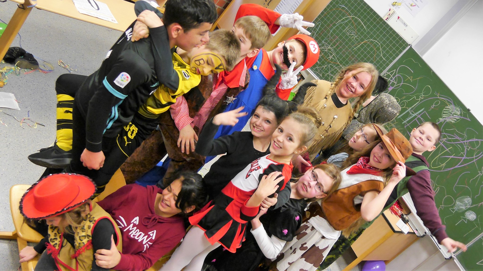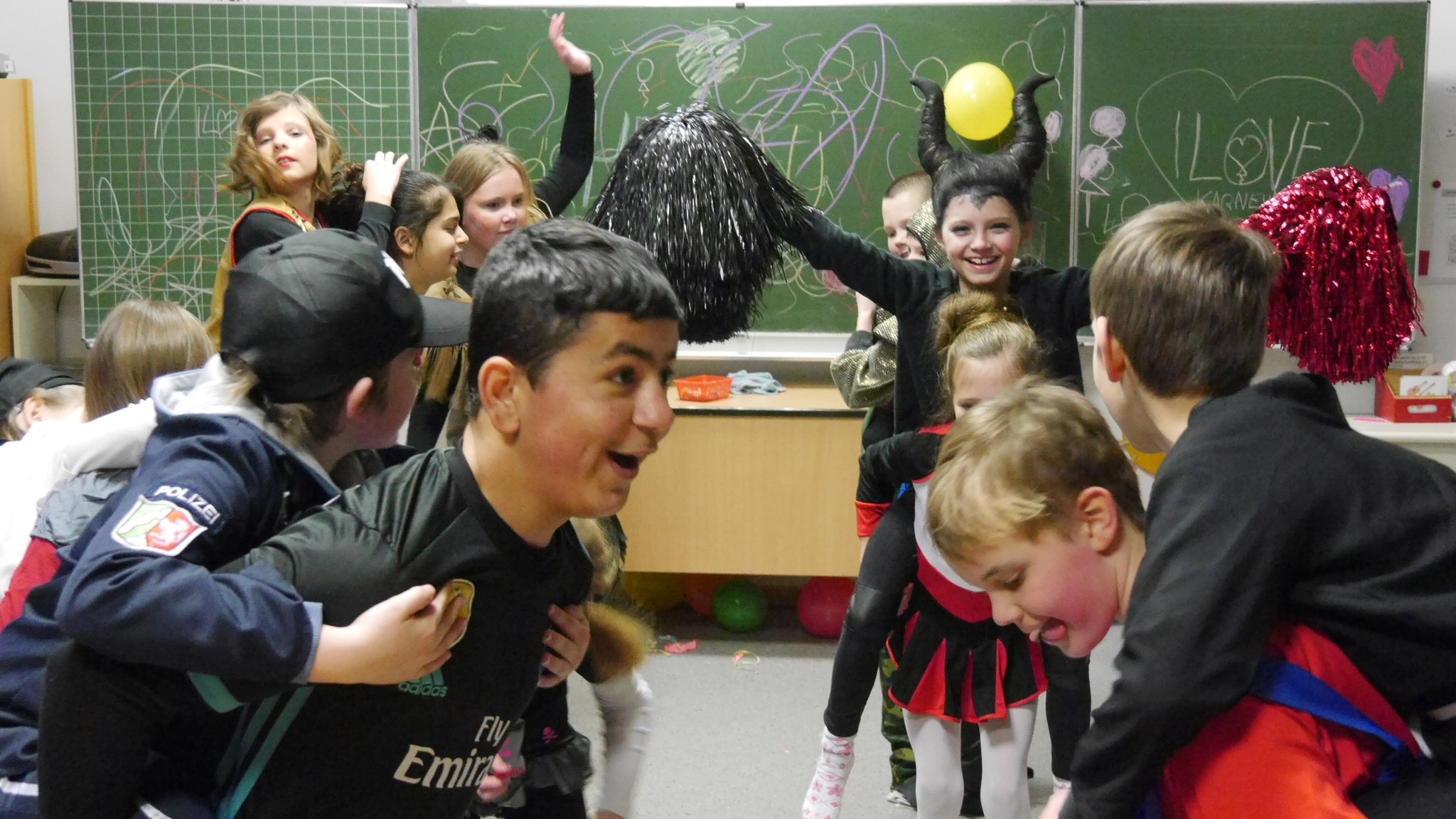 Am Donnerstag, den 8. Februar, durften alle Kinder kostümiert zur Schule kommen. Am Vormittag feierte jeder zunächst in seiner eigenen Klasse. Die Kinder der vierten Klassen planten und organisierten zuvor ihre Veranstaltung im Klassenrat selbst. Auf dem Programm standen von "Mord in der Disco" über "Wettessen" bis zur "Reise nach Jerusalem" zahlreiche Partyspiele. Um 11:11 Uhr gab es dann eine abschließende, große Polonaise durchs ganze Schulgebäude.