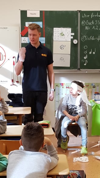 Heute war jemand von der Ersten Hilfe da. Er hat mit uns besprochen wie man Leuten helfen kann. Er hatte zwei Wärmedecken dabei. Dann hat er eine Matte ausgebreitet und Leo auf die Matte gelegt. Dann hat er uns gezeigt wie man die Leute auf die Wärmedecke legen kann.