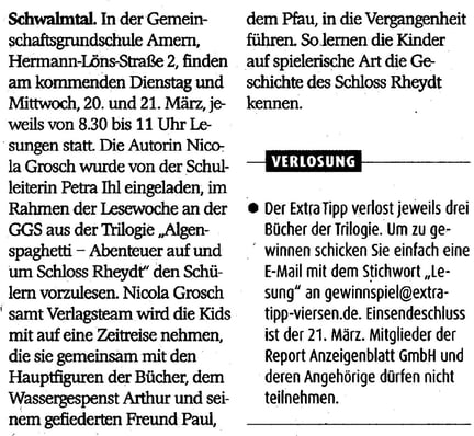 Die Kinderbuchautorin Frau Nicola Grosch besuchte an zwei Tagen unsere Schule und las nacheinander allen Jahrgangsstufen aus ihrer Kinderbuchtrilogie „Algenspaghetti“ vor. In der rasanten und fantasievollen Geschichte erkunden zwei Kinder das Mittelalter und die Geschichte von Schloss Rheydt. Dabei erleben sie viele Abenteuer.