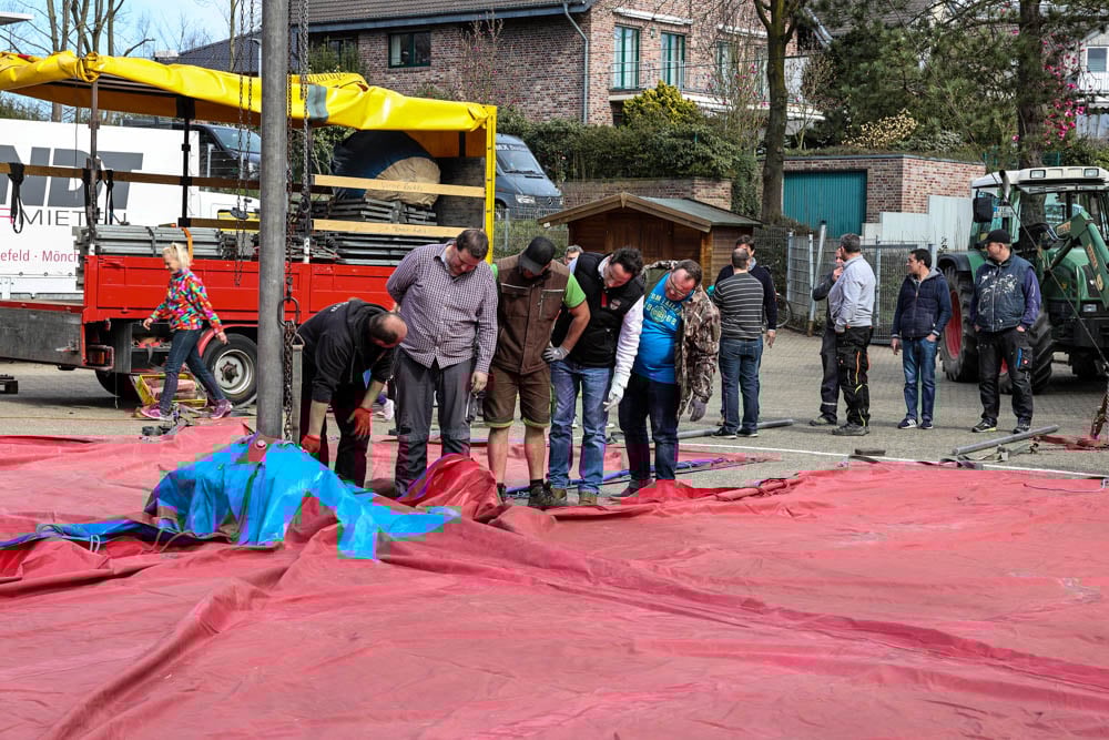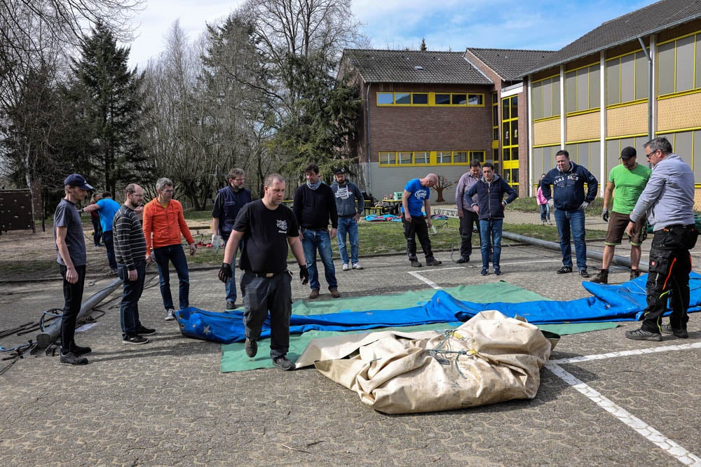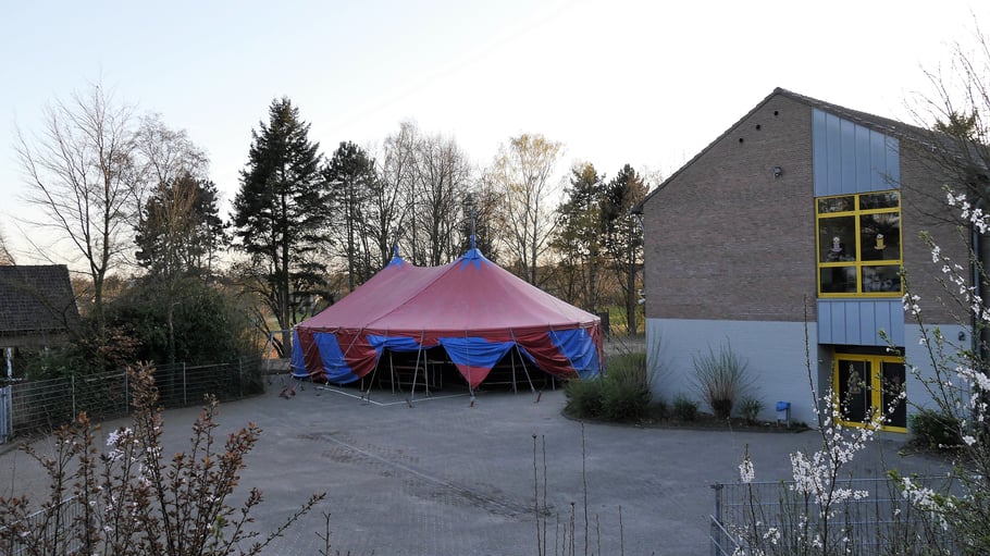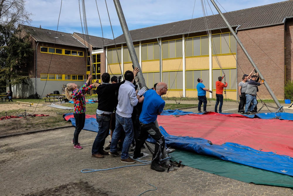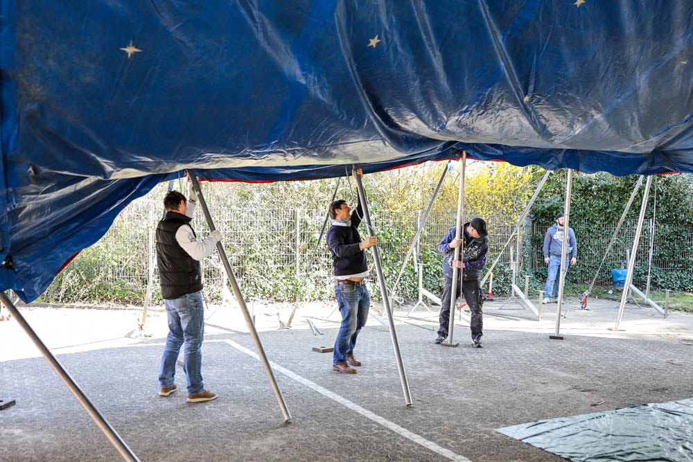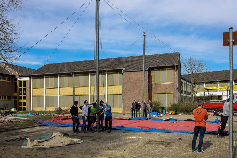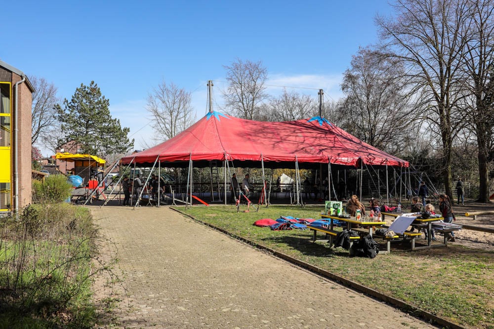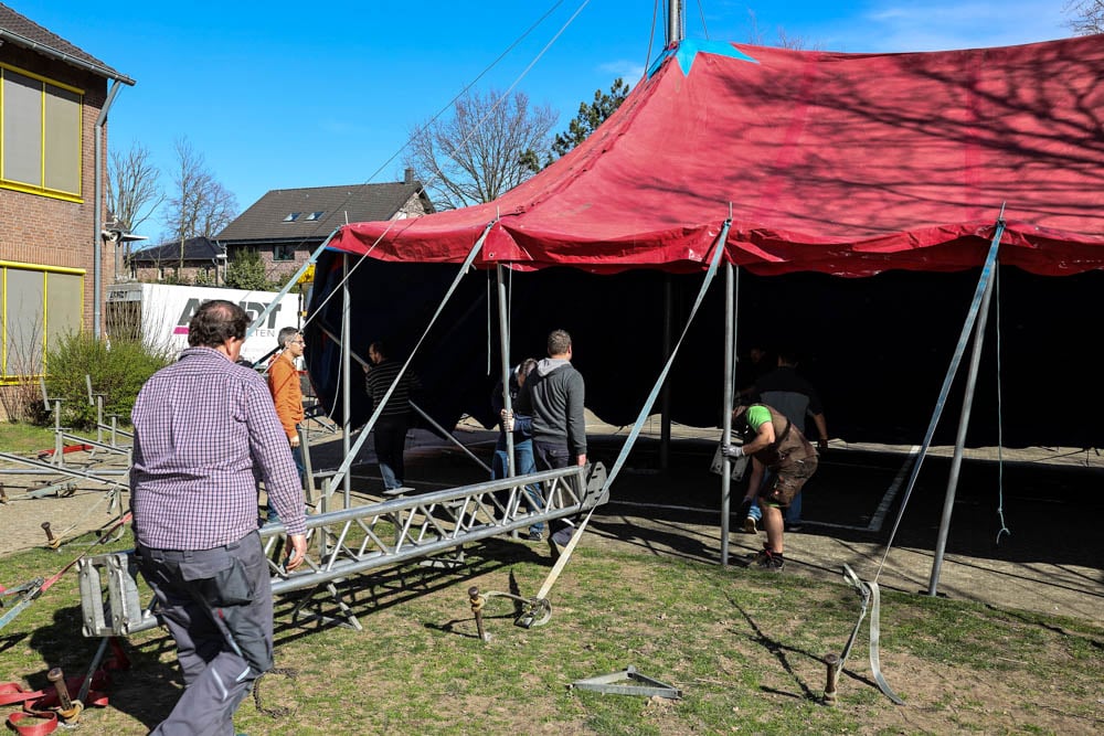 Dank einer Menge Menpower aus der Elternschaft haben wir am Sonntag vor unserer Zirkusprojektwoche innerhalb von ca. vier Stunden mit vereinten Kräften erfolgreich das Zirkuszelt auf dem unteren Schulhof errichtet. Wir danken allen fleißigen Helfern!