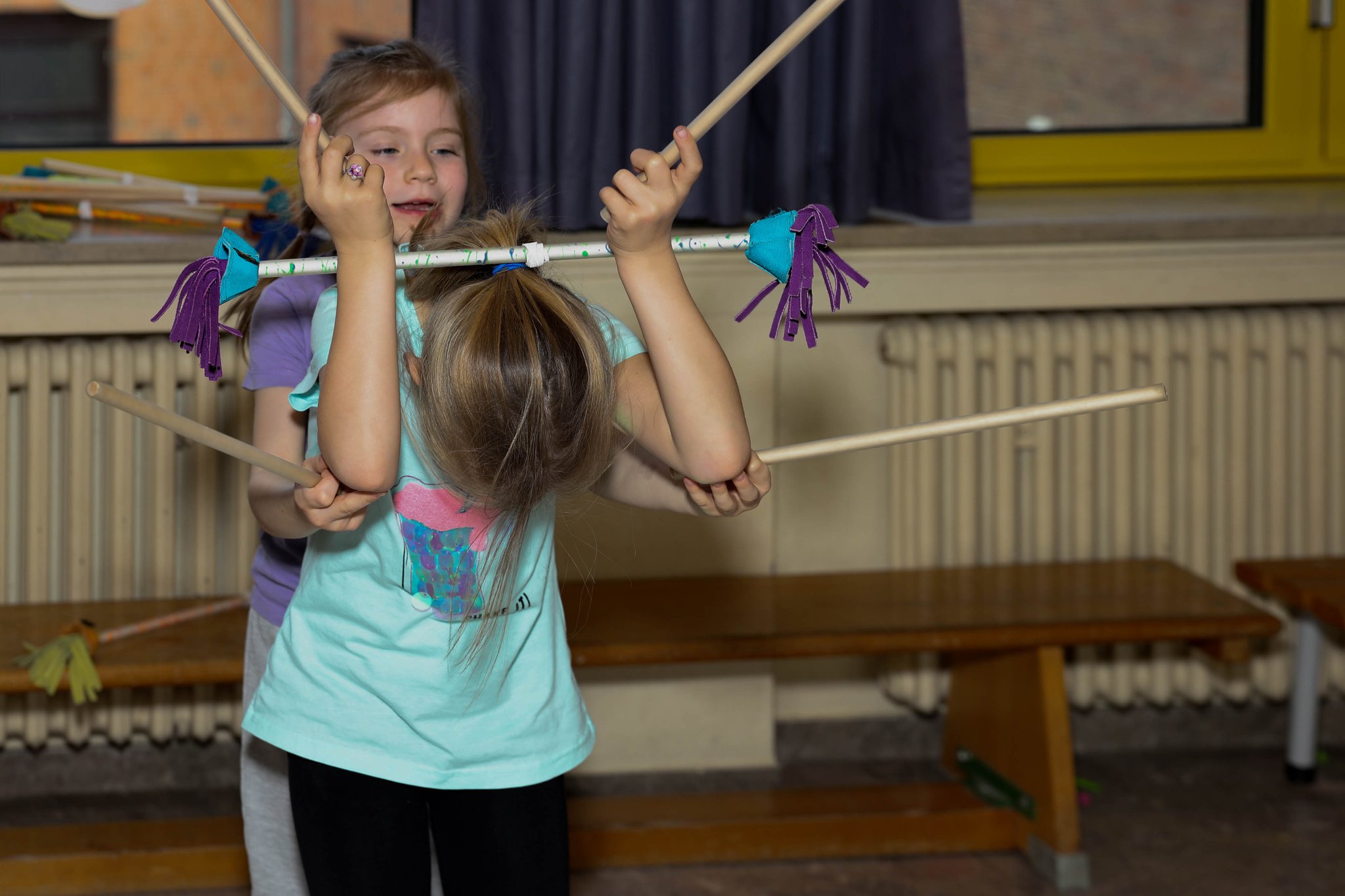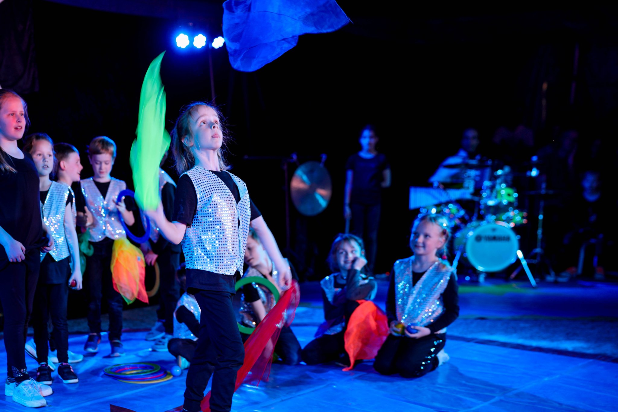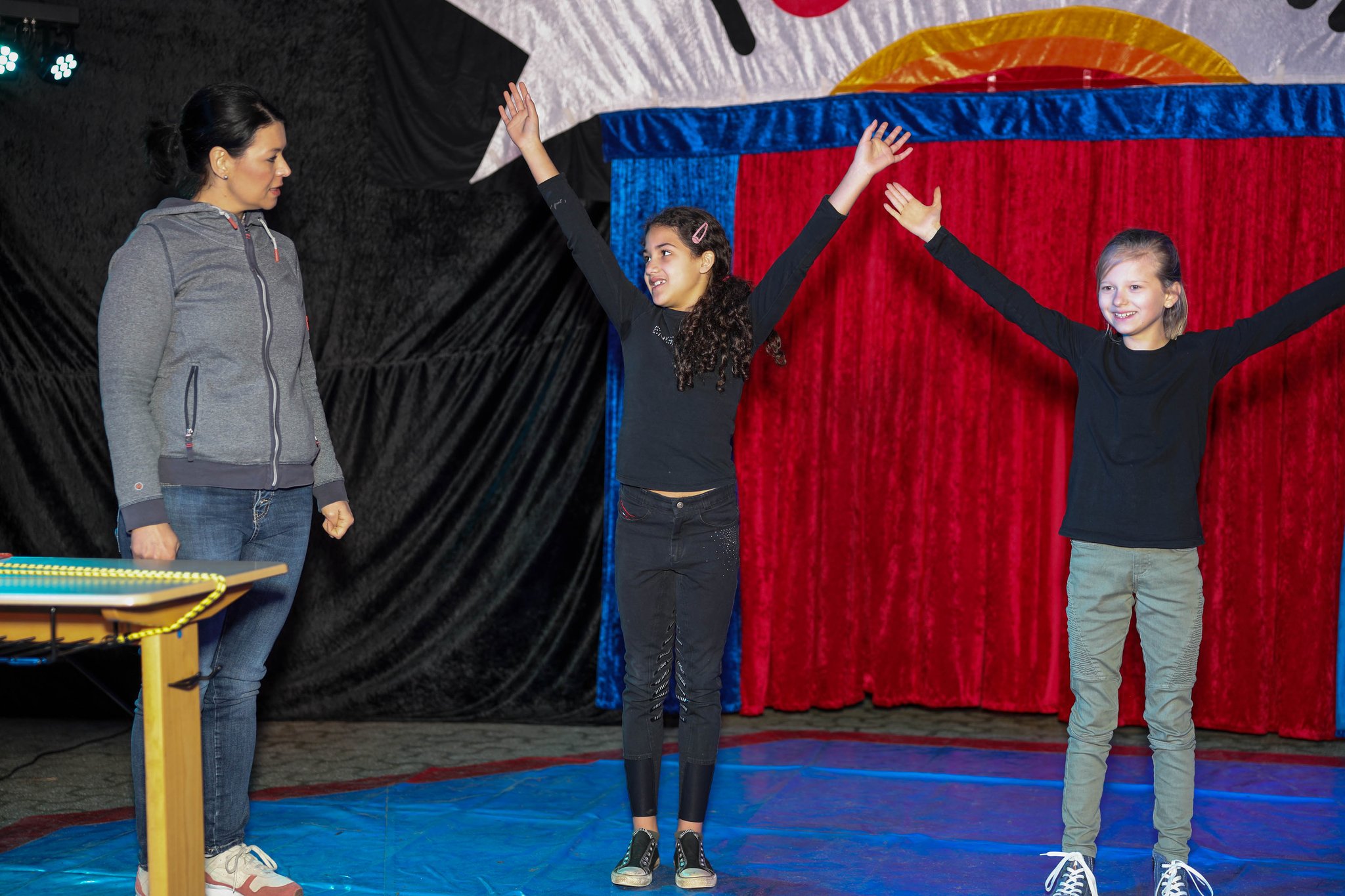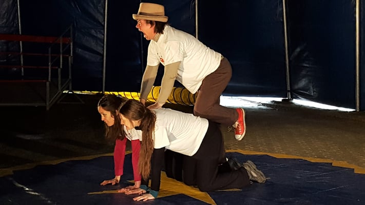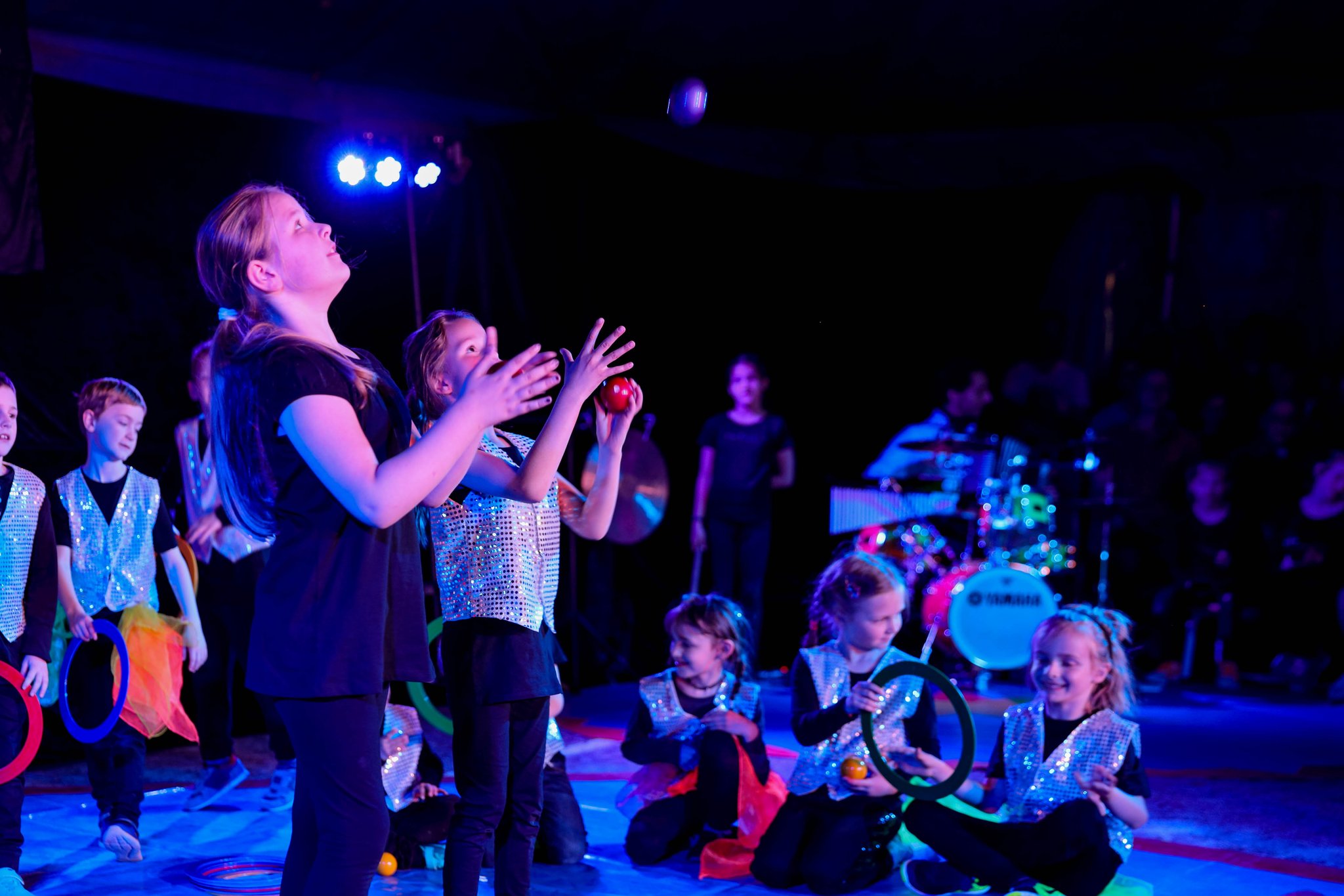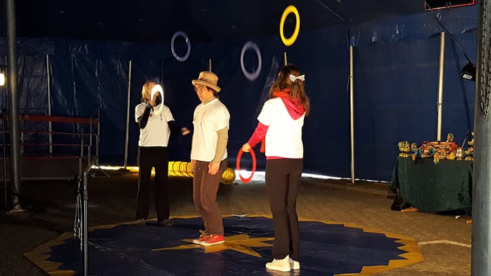 Nach drei Tagen intensivem Üben in den Workshops mit den Zirkuspädagogen, außerdem täglichem freiem Üben mit allen Requisiten und einem zusätzlichen klasseninternen Programm zum Thema Zirkus, haben die Kinder nun eine Menge neue künstlerische Fähigkeiten und Fertigkeiten erworben und sind jetzt in der Lage, die morgige Generalprobe zu meistern.