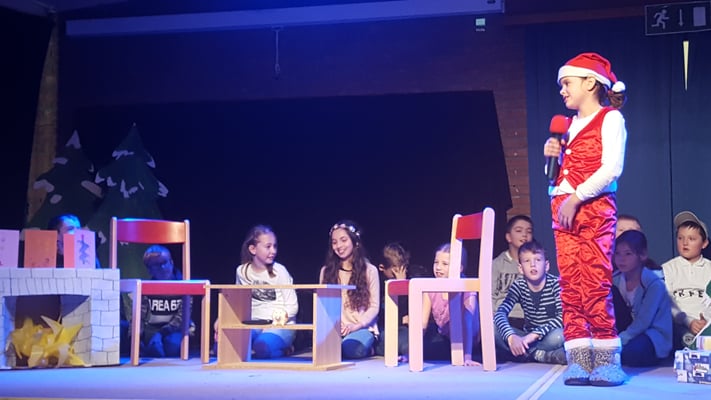 Auch in diesem Jahr gab es an unserer Schule eine gemeinsame Weihnachtsfeier, bei der sich die Klassen gegenseitig mit einem weihnachtlichen Auftritt auf der Bühne in der Aula gegenseitig erfreuten. Neben Lichtertänzen, Liedern und anderen musikalischen Darbietungen zählte dieses Jahr ein Minimusical auf Englisch ("Father Christmas" dargeboten von der Klasse 3c) und eine Schwarzlichtaufführung (der Klasse 4b) zu den besonderen Highlights.