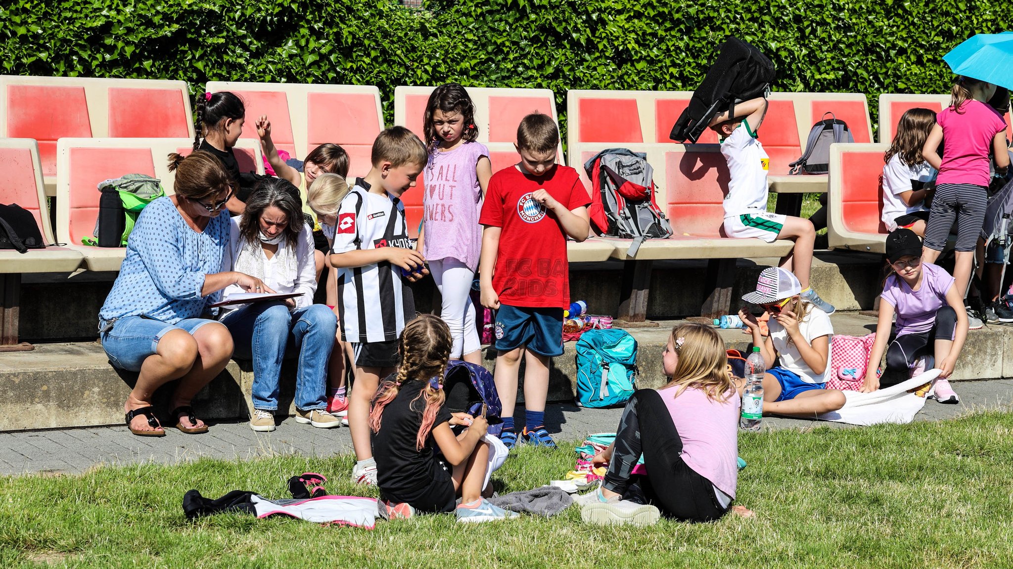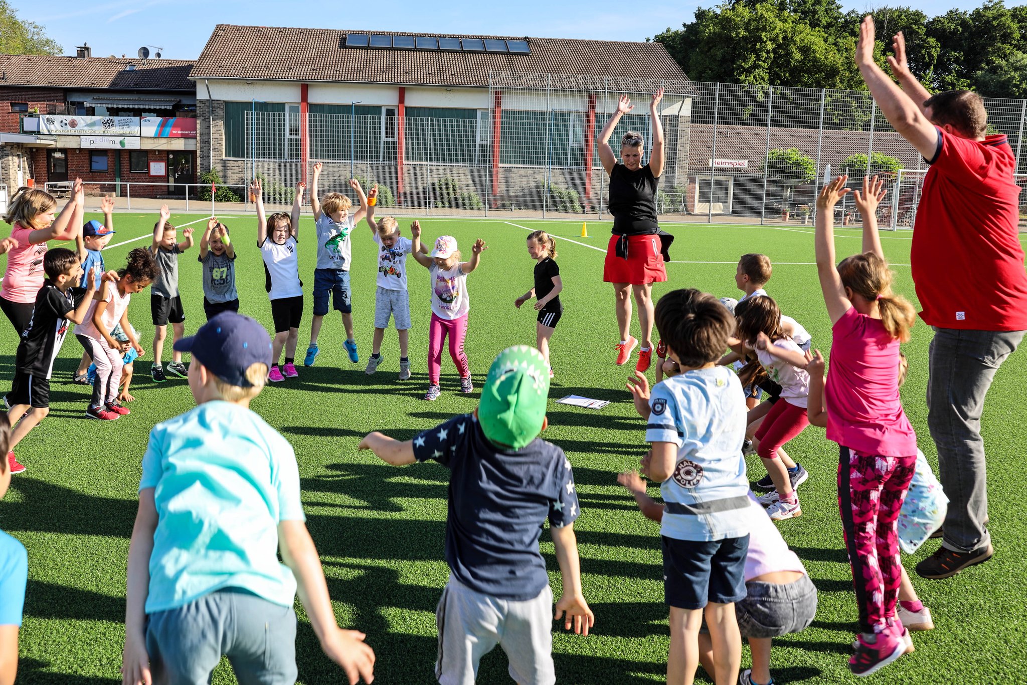 Am Montag halfen wieder viele Eltern mit und ermöglichten unter der Leitung von Frau Berghaus den Bewegungstag mit vielfältigen Bewegungsstationen für die Kinder auf dem ganzen Schulgelände. Das Warm-up aller Kinder übernahm Frau Siefke mit ihrer Klasse 2c, die alle Teilnehmer mit ihrem Fitnesstanz gleich zu Beginn kräftig ins Schwitzen brachten und koordinativ forderten.