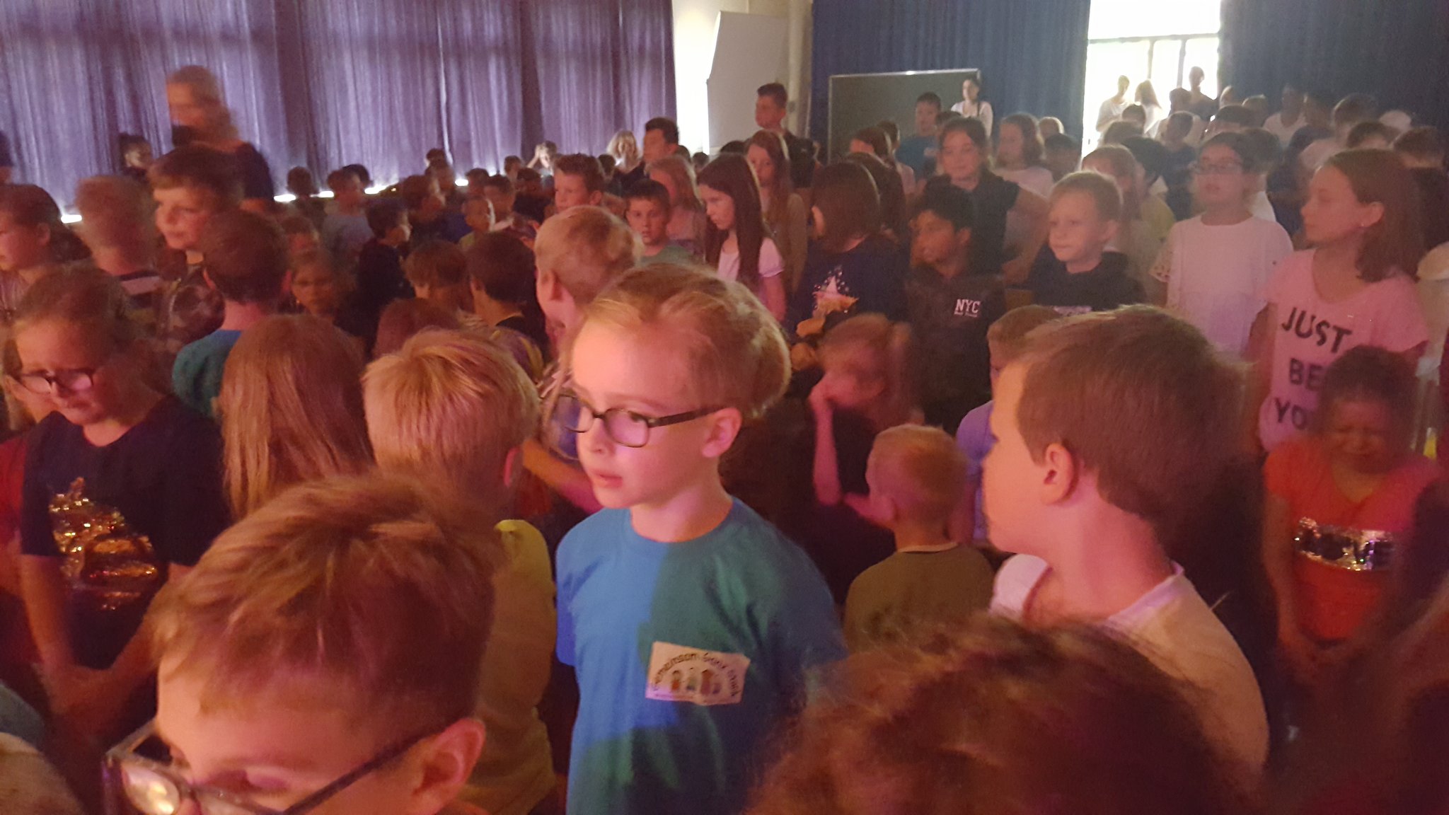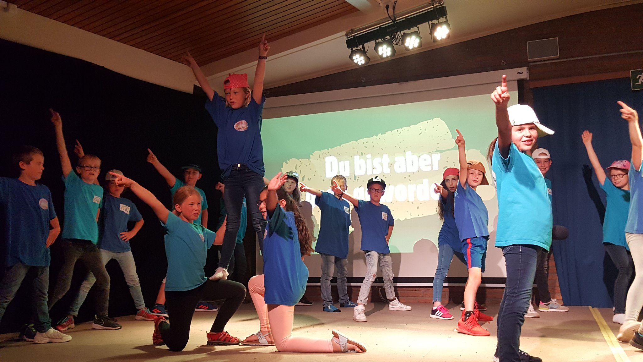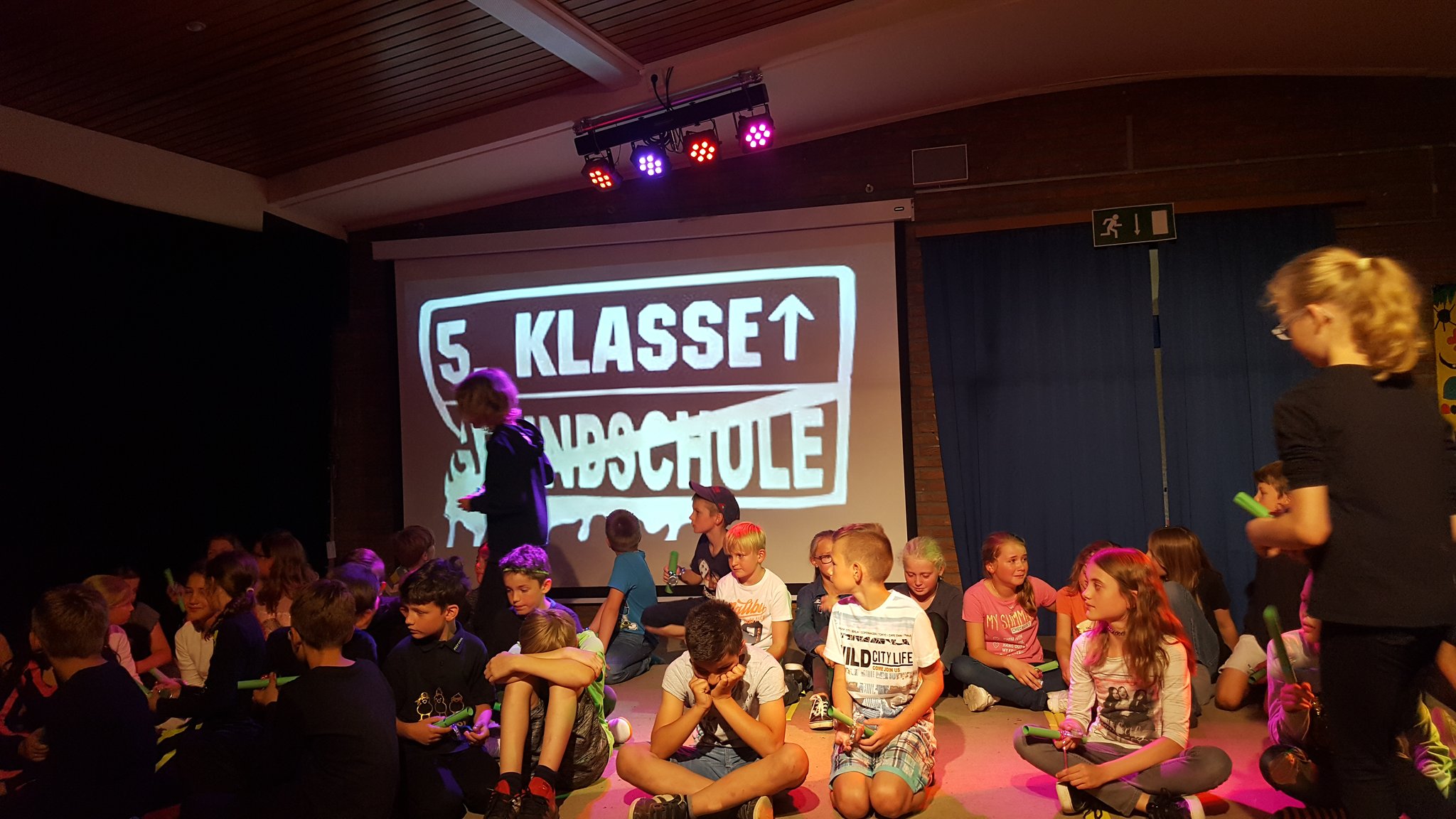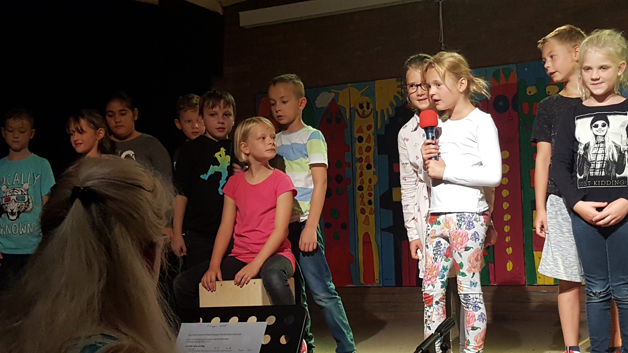 Nach einer offiziellen Abschiedsrede von Frau Arndt gab es noch eine kleine Überraschung: Zunächst sang ein einzelnes Kind aus der Klasse 1b zum Klavierspiel von Herrn Stäglich ein Mutmach-Lied für die Viertklässler. Kurz darauf stand ein zweites Kind aus der Klasse 1b auf und sang mit. Es folgte ein drittes und viertes, bis plötzlich die halbe 1b, dann die ganze, dann die 1c, die 3a, die 3c und schließlich der ganze Saal aufstand und mitsang. Frau Siefke stieg mit der Gitarre ein, 3 Kinder aus der 3c und ein Junge aus der 2a spielten auf Schlaginstrumenten mit und so groovte schließlich der ganze Saal. Dieser abschließende Flashmob zauberte dann auch wieder ein leichtes Lächeln auf die traurigen Gesichter der VIertklässler, die dann noch bei dem Song entlassen wurden.