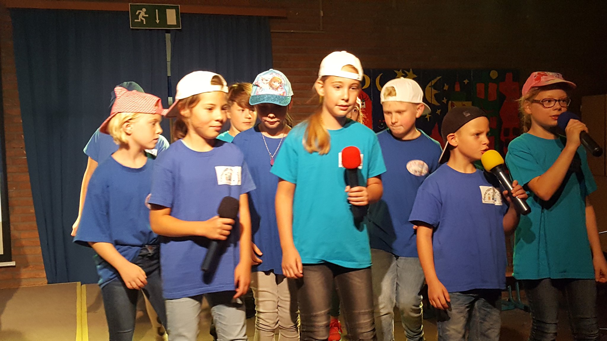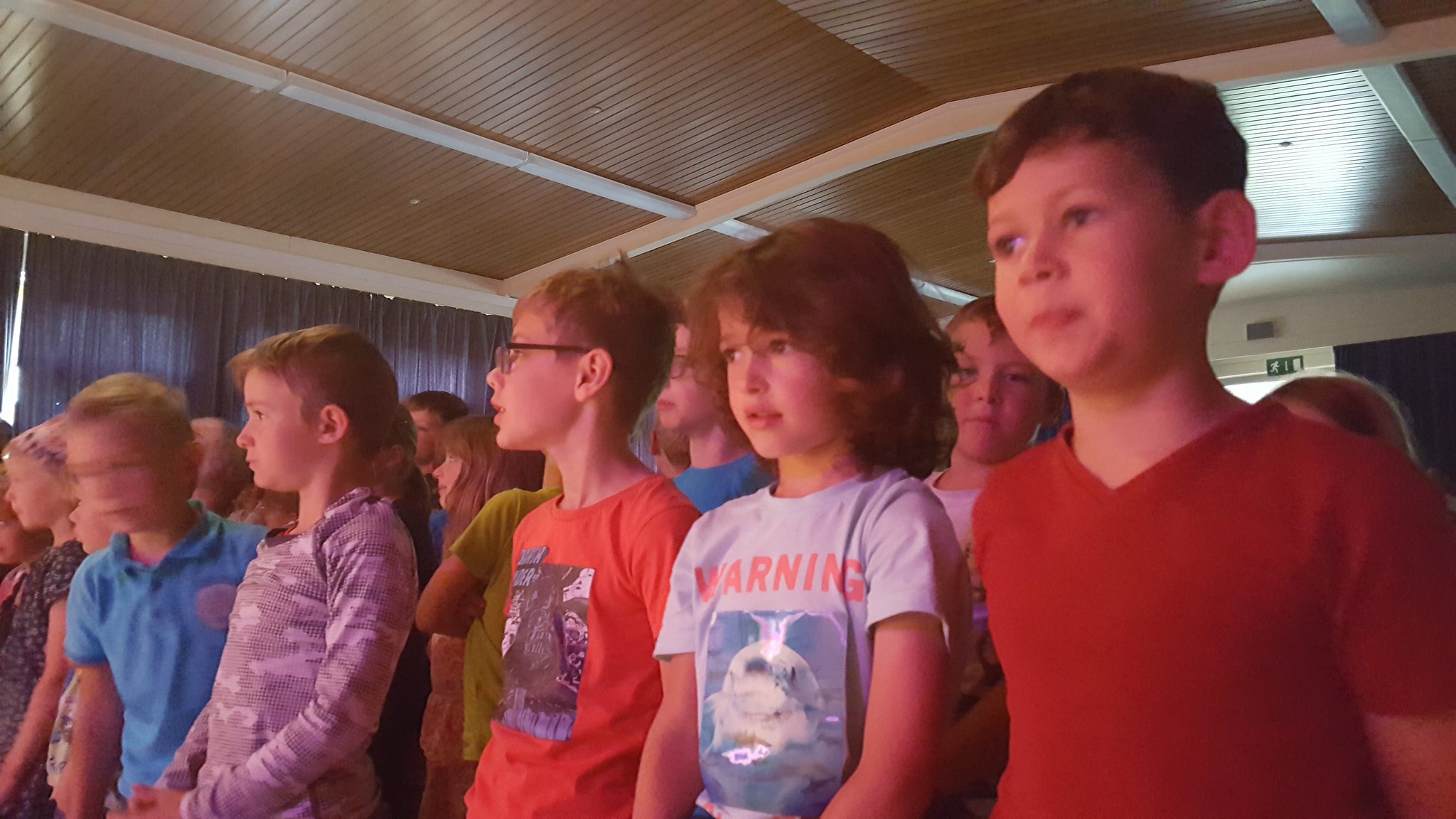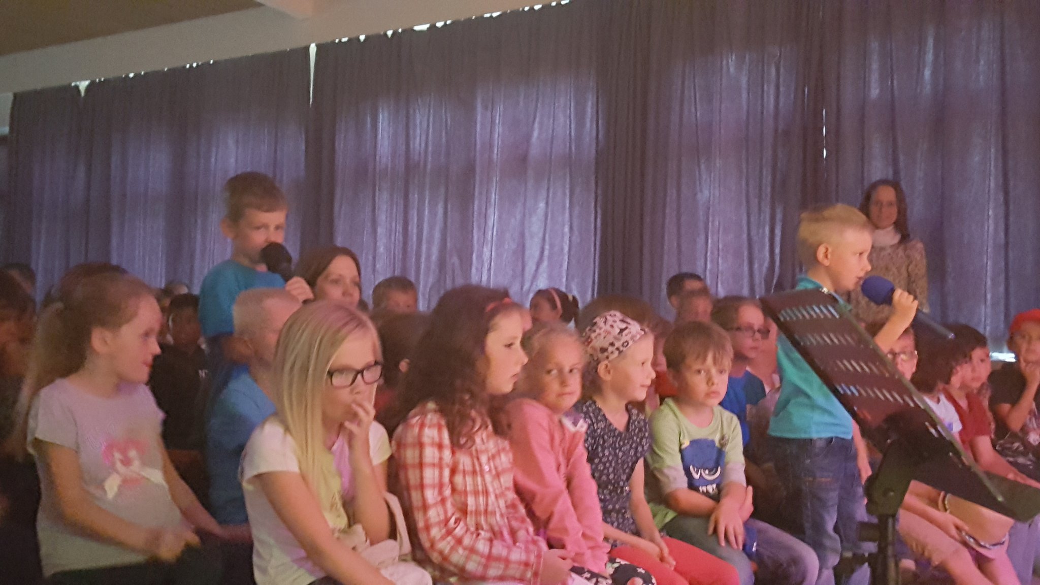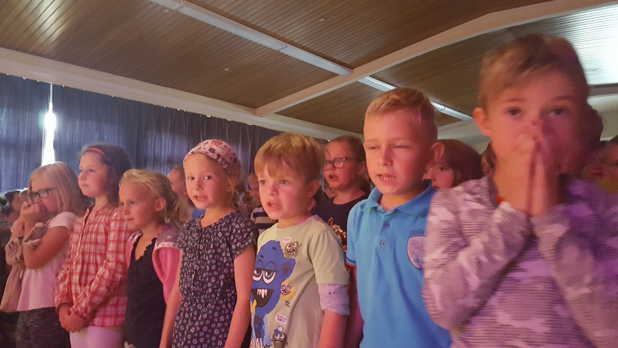Nach einer offiziellen Abschiedsrede von Frau Arndt gab es noch eine kleine Überraschung: Zunächst sang ein einzelnes Kind aus der Klasse 1b zum Klavierspiel von Herrn Stäglich ein Mutmach-Lied für die Viertklässler. Kurz darauf stand ein zweites Kind aus der Klasse 1b auf und sang mit. Es folgte ein drittes und viertes, bis plötzlich die halbe 1b, dann die ganze, dann die 1c, die 3a, die 3c und schließlich der ganze Saal aufstand und mitsang. Frau Siefke stieg mit der Gitarre ein, 3 Kinder aus der 3c und ein Junge aus der 2a spielten auf Schlaginstrumenten mit und so groovte schließlich der ganze Saal. Dieser abschließende Flashmob zauberte dann auch wieder ein leichtes Lächeln auf die traurigen Gesichter der VIertklässler, die dann noch bei dem Song entlassen wurden.
