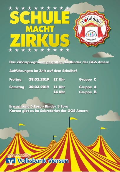 Unter der Leitung vom Zirkus Toussini findet die Zirkusprojektwoche an der GGS Amern vom 25. bis zum 30. März 2019 statt. Diese Projektwoche wurde lange von den Lehrern, den Betreuern, den Eltern, dem Förderverein und den Kindern geplant.