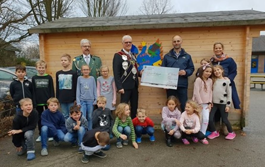 Nach dem erfolgreichen Vogelschuß konnte nun der Erlös an Herrn Thiery vom Förderverein übergeben werden. Die Übergabe des Schecks erfolgte vor der 2016 von der Bruderschaft errichteten "Sebastianushütte", in der seither Spielgeräte für die Pausenausleihe aufgehoben werden. Zur Erinnerung an die gute Zusammenarbeit mit der St. Sebastianus-Schützenbruderschaft ist dort ein Königsvogel angebracht.