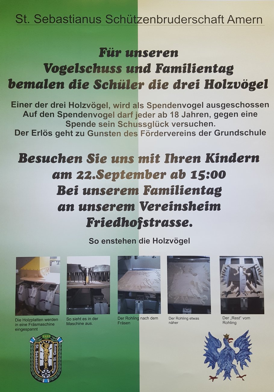 Wie bereits 2015 hat die St. Sebastianus-Schützenbruderschaft anlässlich Ihres Vogelschusses einen Spendenvogel zu Gunsten des Fördervereins der Gemeinschaftsgrundschule Amern ausgeschossen. Im Gegenzug gestalteten die Kinder der Klasse 3c unter Leitung von Frau Pongs gleich mehrere Vögel für den diesjährigen Vogelschuss.