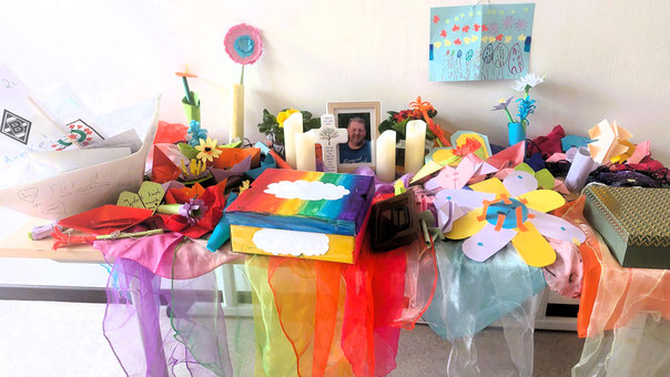 Im Seelsorgeraum von Frau Schröder wurde ein Gedenktisch hergerichtet. Dort haben bereits einige Kinder ihre Anteilnahme auf ihre Weise zum Ausdruck gebracht und gemalt, gebastelt oder geschrieben.