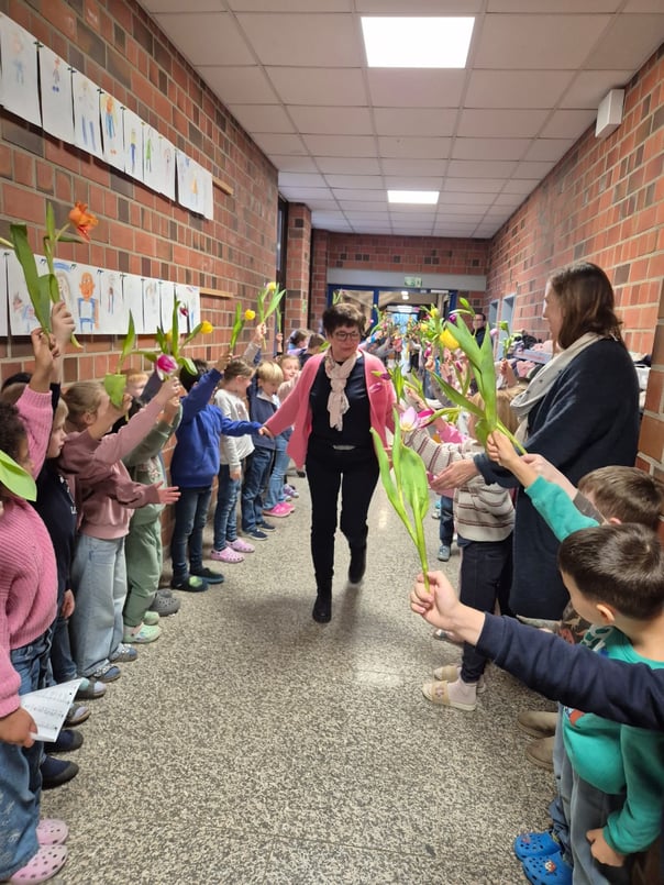 Der Abschied fiel uns allen schwer, und so blieb keine Seite ganz ohne Tränen. Besonders berührend war der Moment, als die Kinder sie mit je einer Blume in der Hand durch ein Spalier begleiteten – ein stilles, liebevolles Dankeschön für all die Jahre, in denen sie für sie da war.